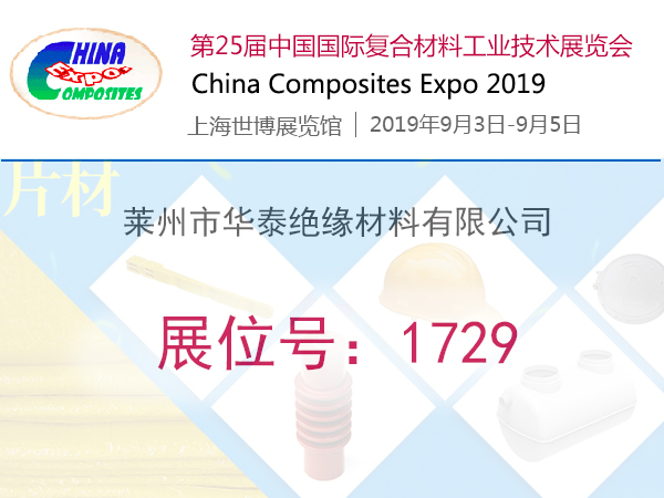 2019.08.12第25屆中國國際復合材料工業(yè)技術展覽會,于2019年9月3日到9月5日在上海世博展覽館舉行,萊州市華泰絕緣材料有限公司,展位號1729,歡迎您! -